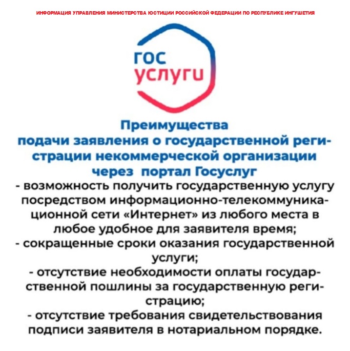 В общественной приемной полномочного представителя Президента России в Республике Ингушетия (г. Магас, пр-кт Идриса Зязикова, д. 2), в приемной Управления Минюста России Минюста России по Республике Ингушетия (г. Назрань, пр-кт Базоркина 16 «а») и в МФЦ города Назрань (г. Назрань, пр-кт Базоркина 70) выставлены баннеры с информацией о преимуществах подачи заявления государственной регистрации некоммерческих организаций через портал Госуслуги, об отсутствии обязательств по уплате государственной пошлины, о сокращении срока оказания услуги.