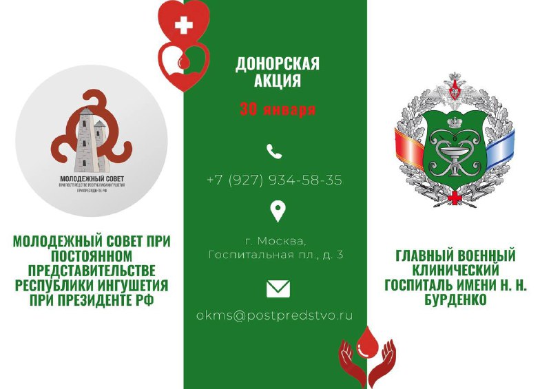 Молодежный совет при Потспредстве Ингушетии приглашает всех желающих принять участие в ежегодной донорской акции, которую Постпредство проводит третий год подряд.