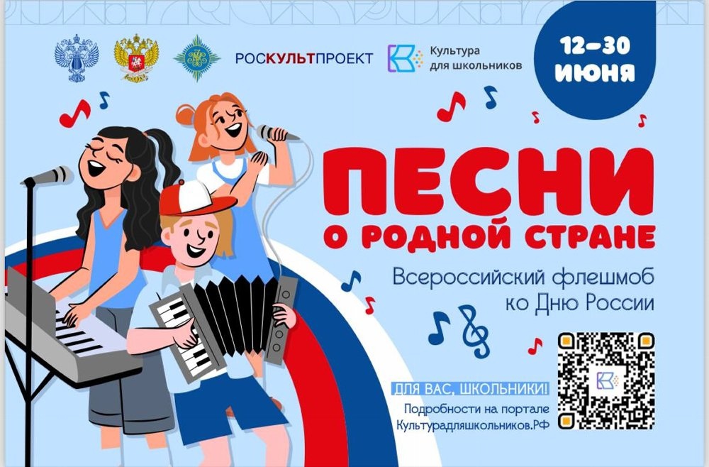 С 12 по 30 июня 2024 года в рамках межведомственного культурно-образовательного проекта «Культура для школьников» пройдет Всероссийский флешмоб «Песни о родной стране», направленный на патриотическое воспитание молодых людей,