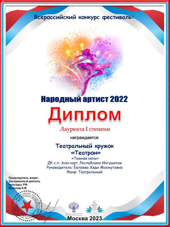 Воспитанники Дома Культуры с. п. Али — Юрт представили театральную постановку посвященную Дню победы и стали лауреатами 1 степени в театральной номинации » Тёмная ночь » Всероссийского конкурса- фестиваля » Народный артист 2022″.