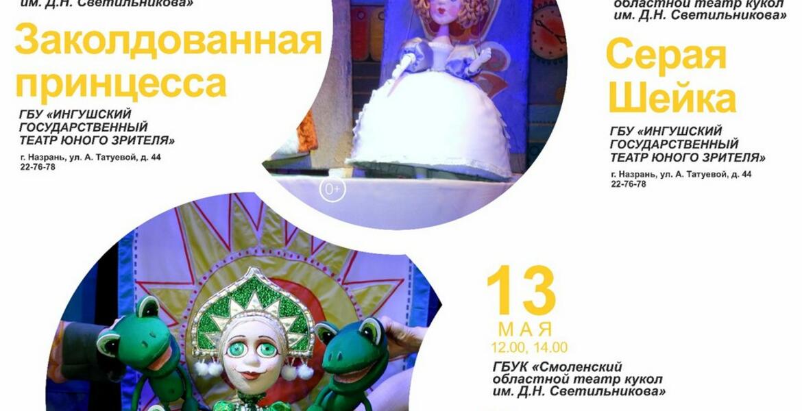 В рамках направления по поддержке детских и молодежных театров «Больших гастролей» на сцене Ингушского театра юного зрителя кукольники из Смоленска покажут спектакли: «Заколдованная принцесса» Е. Павлова в постановке П. Акинина; «Царевна-лягушка» в постановке того же режиссера; «Серая шейка», автор и режиссер-постановщик А. Н. Абрамов.