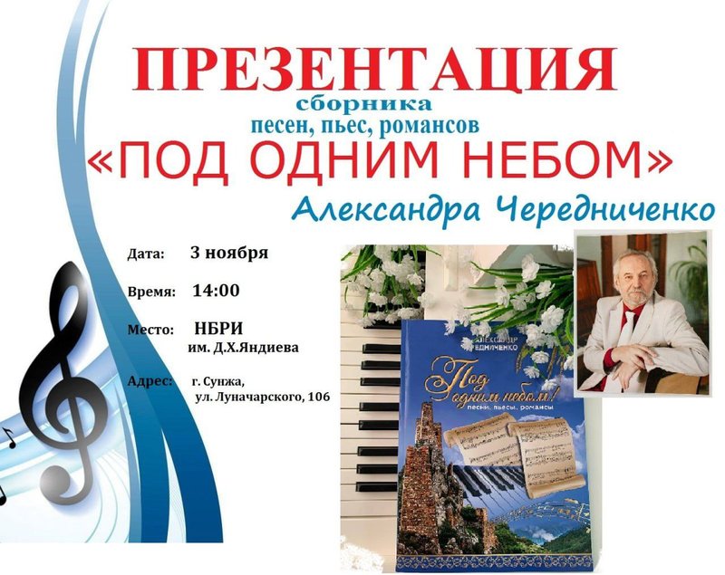 По словам собеседника, в сборник вошли песни, пьесы и романсы талантливого композитора и исполнителя, члена Союза композиторов России, заслуженного деятеля культуры РИ Александра Чередниченко, внесшего весомый вклад в укрепление культурных связей между Ингушетией и Краснодарским краем, где ныне он проживает. Также в сборнике представлены иллюстрации работ ингушских и кубанских художников.