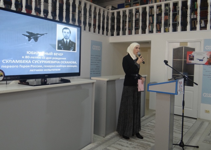 Памятное мероприятие, посвященное 80-летию со дня рождения летчика-испытателя, генерал-майора авиации, первого Героя России Суламбека Сусаркиевича Осканова, собрало сегодня в Национальной библиотеке представителей научной и творческой интеллигенции, учащихся и преподавателей школ, читателей библиотеки, журналистов.