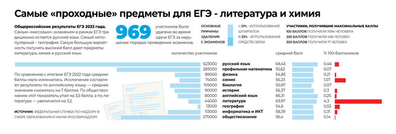 Отдельно глава Рособрнадзора выделил изменения, замеченные в результатах экзаменов по разным предметам. Например, увеличилось число высокобалльников по русскому языку, физике, биологии, географии, литературе. Среди этих дисциплин выше всего доля высокобалльников, по данным пресс-службы Рособрнадзора, оказалась по литературе и русскому языку — 25 и 26% соответственно. А вот по географии результатов в 81–100 баллов — всего 6,7%.