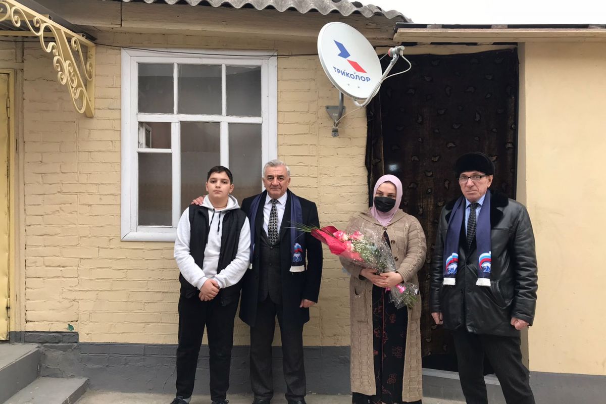 Секретарь местного отделения партии в г.Назрань Юсуп Богатырёв поздравил с 8 марта жену Вышегурова Зелимхана, погибшего в ходе специальной военной операции, Танзилу Колоеву