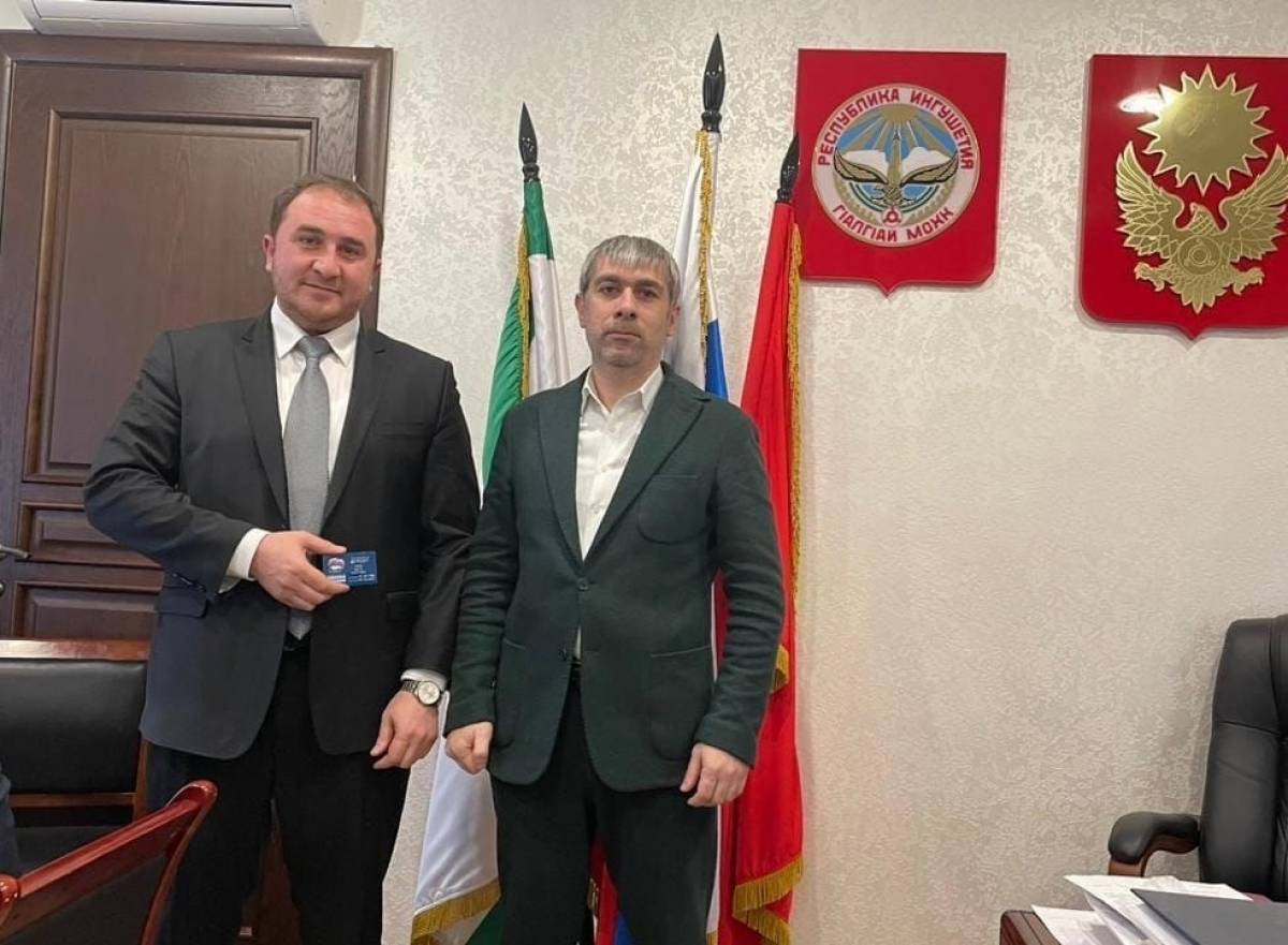 Секретарь местного отделения партии в г. Магас Артур Албаков вручил партийные билеты мэру г. Магас Усману Аушеву и начальнику архитектурного отдела мэрии Хадиже Гойговой.