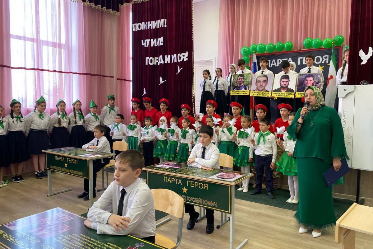 Парты открыли в честь: Ислама Заурбекова, Мурада Евлоева, Халида Евлоева и Тимура Хадзиева, погибших при исполнении воинского долга на Украине.