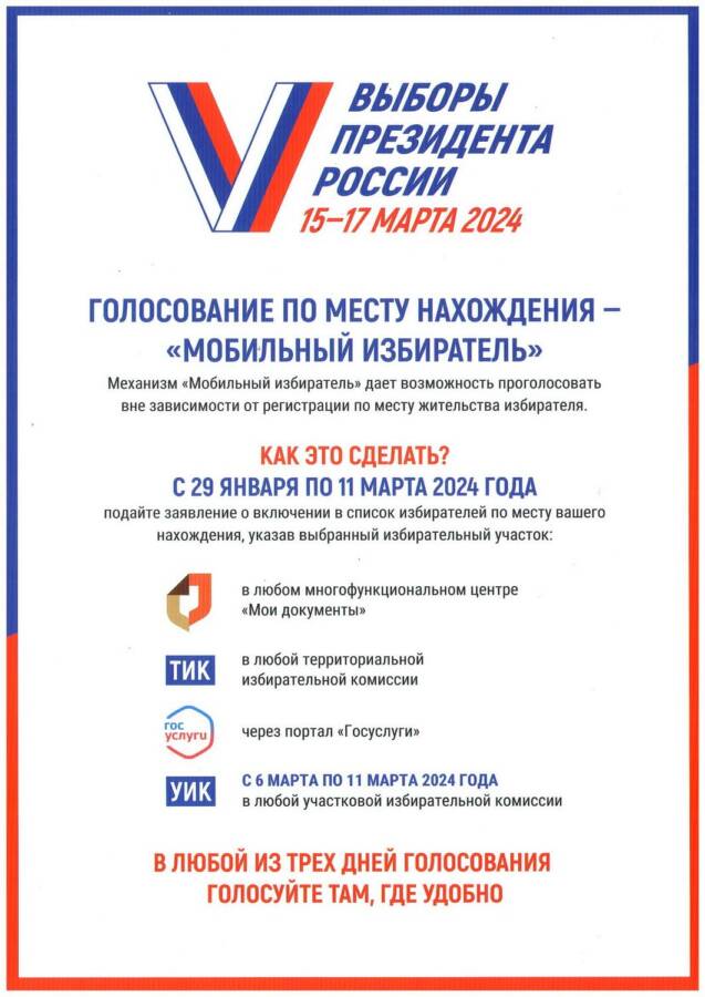 Уважаемые избиратели! Если 15, 16 и 17 марта 2024 года у Вас не будет возможности проголосовать на выборах Президента Российской Федерации по месту жительства (регистрации),