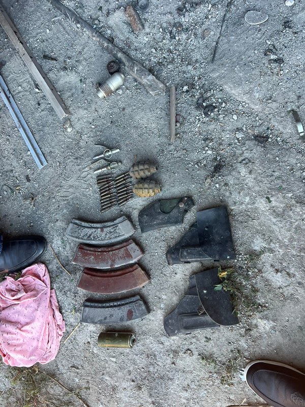 На месте происшествия обнаружены две гранаты Ф-1, пустые магазины от автомата, пустые кобуры для пистолета, запалы, предположительно, снаряд подствольного гранатомета, дымовые шашки.