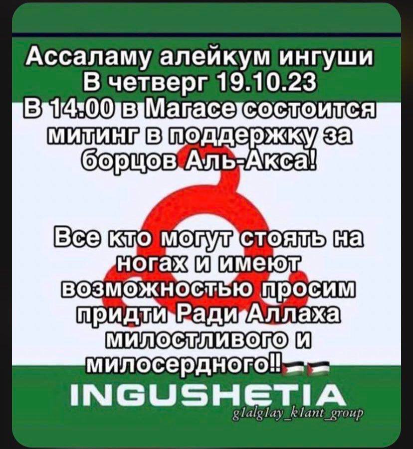 В сети интернет распространяется информация с призывами к проведению 19 октября 2023г. в г.Магасе митинга в поддержку Палестины.В администрацию города заявка о проведении митинга не поступала. Тем самым доводим до вашего сведения, что согласно Федерального закона N 54-ФЗ, несакционированные митинги запрещены. Мы знаем позицию Президента России и то, что он всецело поддерживает Палестину, прилагая все усилия для мирного урегулирования палестино-израильского конфликта. Призываем жителей республики не поддаваться на провокации и сохранять бдительность во избежание последствий!