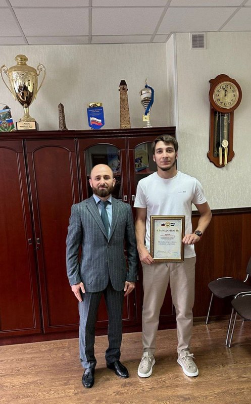 Как сообщили в спортивном ведомстве региона, в ходе встречи министр Али Дошхоклоев вручил Адаму благодарность за его высокие результаты в хоккее.